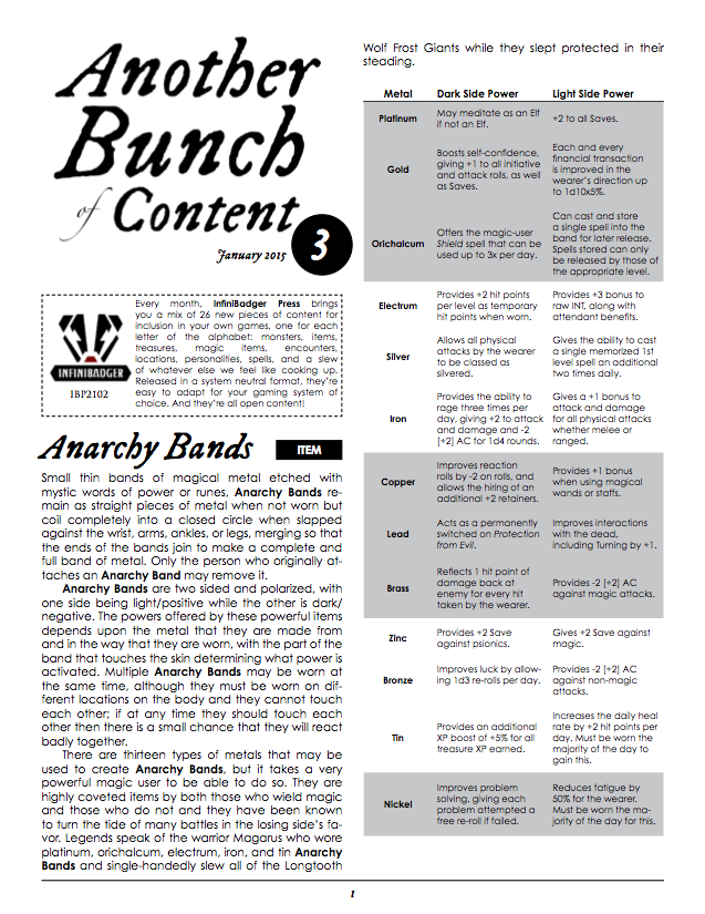Issue #3 January 2015Contents: Anarchy Bands, Bolgar’s Fist, Challak Raiders, Dragon Ticks, Entirodon, Faith’s Hammer, Golem Speaking, Hathamandar Lord of Strife, Iambic Curse, Jackleg, Kaolis, Lesser Signature, Mashka Gateway to the Golden Realm, Neolithic Ward, Octarchy of Gris, Pannikins of Eltash, Questers, Ravagers, Spoileaters, Tabinidic Demon, Unatone, Verbatim, Warbler, Yellow Iron Weapons, Zoo of Tyloem Available via DriveThruRPG and RPGNow. $1.25 |